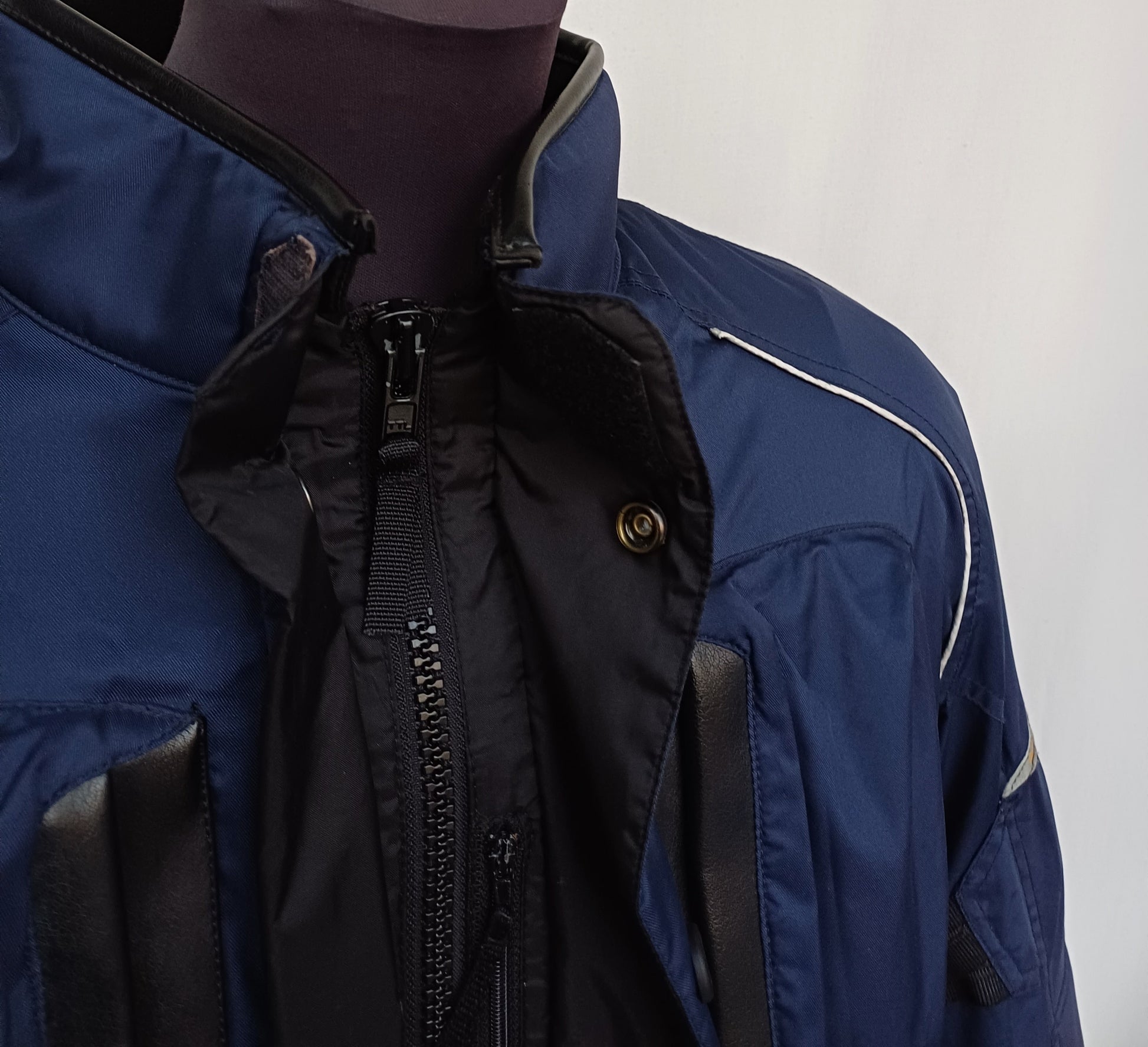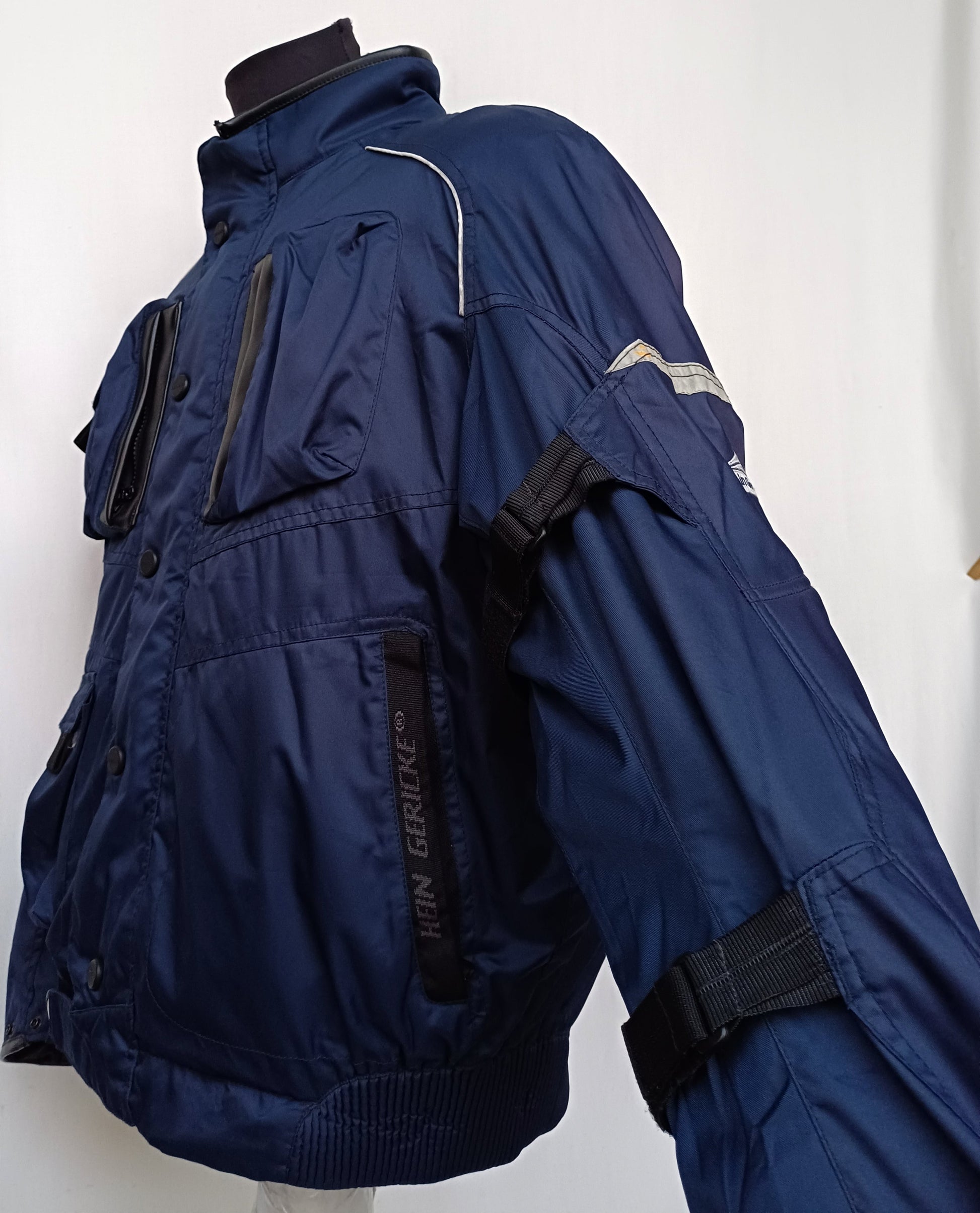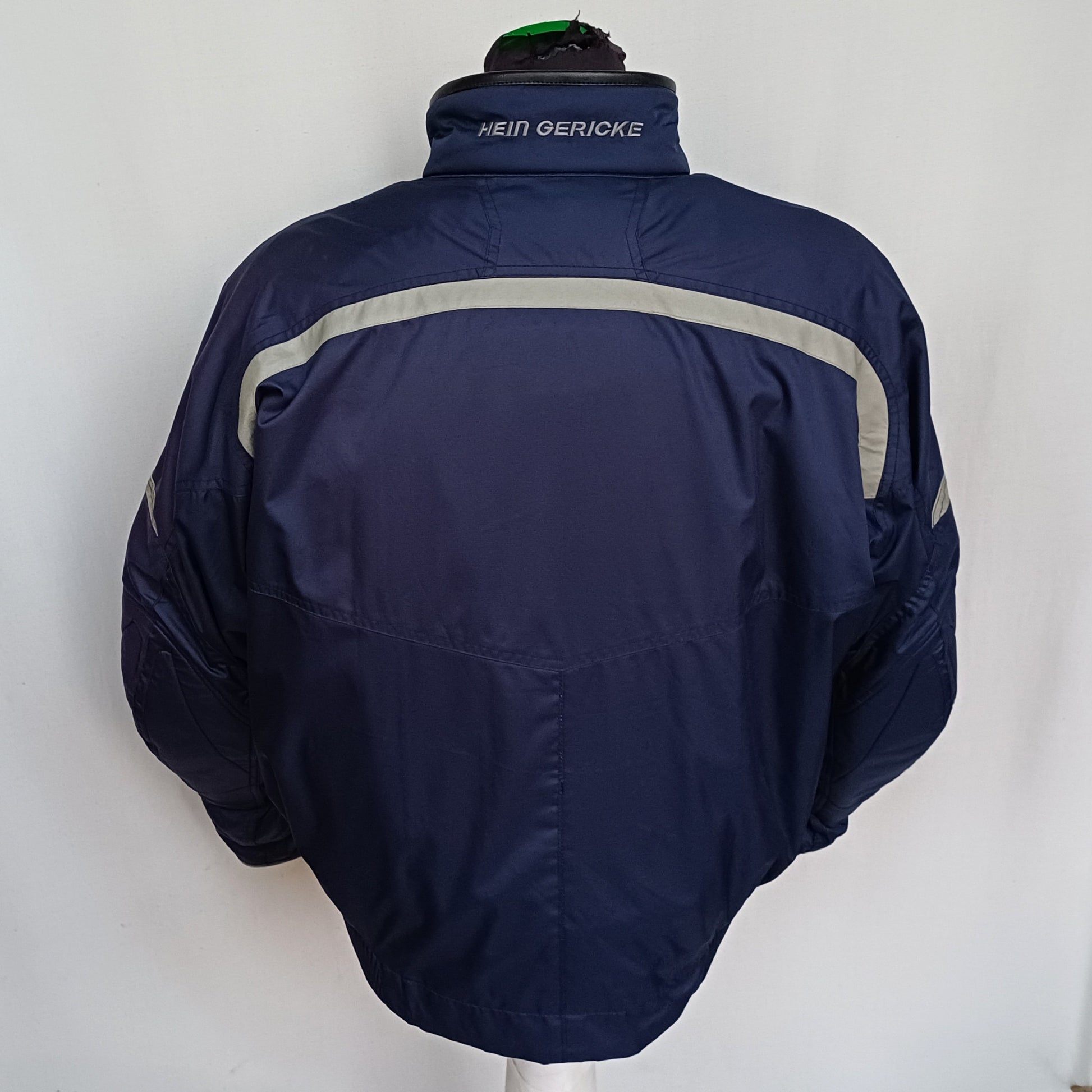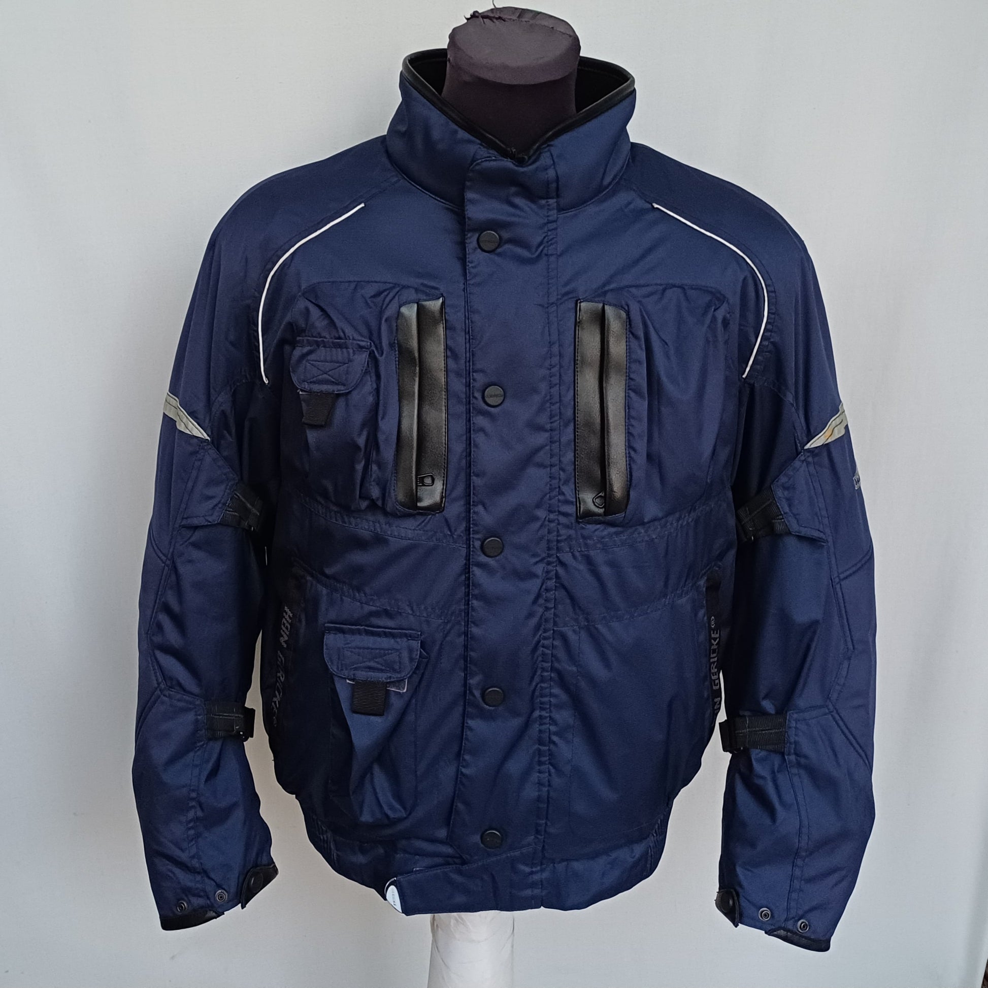 Get your hands on this wonderful navy blue motorcycle jacket in great condition , it has reflective tapes , also it has padding(can be removed) on shoulders , elbows and at the back , it has lining that can be removed , also it has leather on the collar and on cuffs , it's made by Hein Gericke.